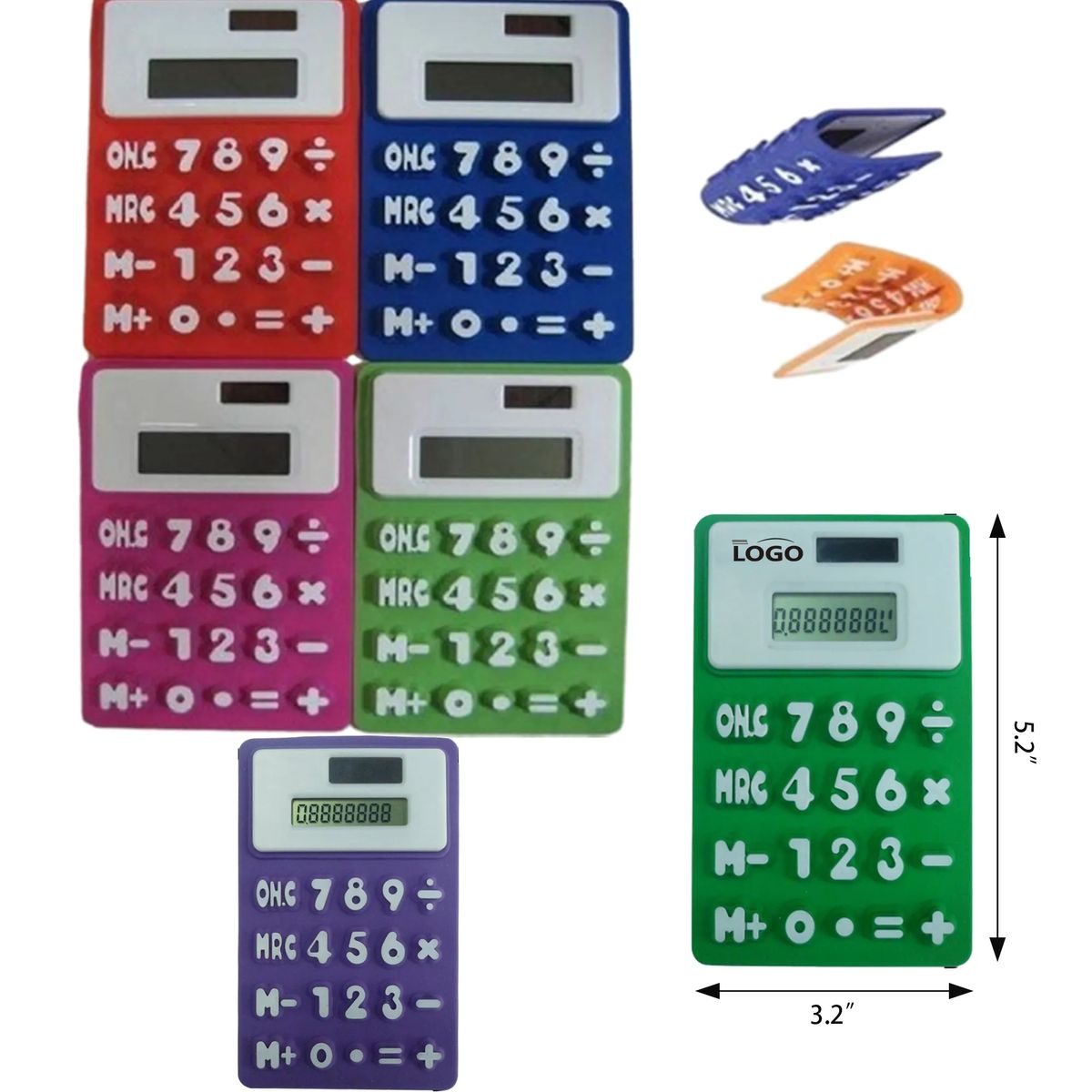 Additional Information5.2" x 3.2" x 0.4" ABS+Silicone fabric portable foldable solar silicone calculator MOQ 50PCS